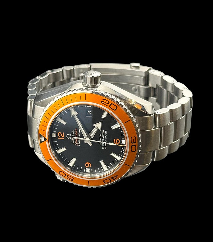 This watch is the most iconic model ever released by omega model no 232.30.46.21.01.002,with case size 45.5 mm.The case is made of stainless steel.The bezel is in orange color made of ceramic and rotatable.Dial is matte black with date window and arabic numerals.The glass is sapphire crystal and scratch resistant.This watch comes in 8500 automatic movement and visible through sapphire crystal glass.The watch overall condition is mint with no visible scratch or dent.It comes with warranty card dated 2018 and original box.
